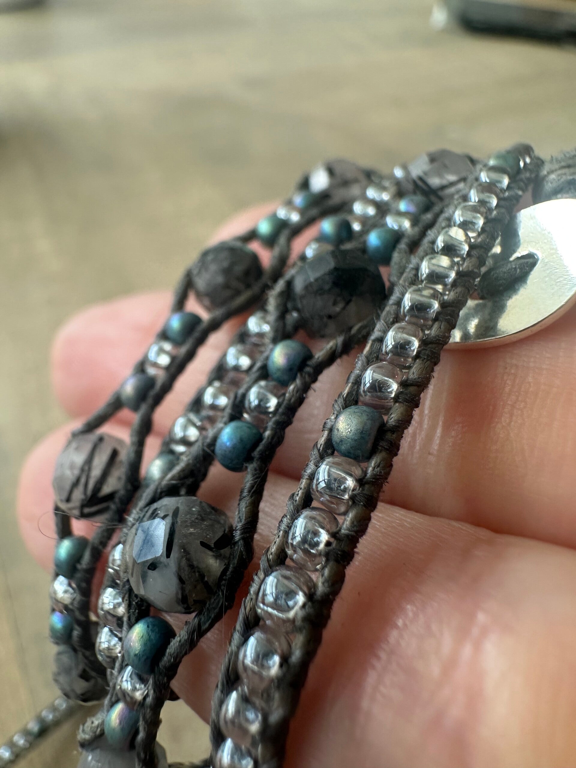 Rutielkwarts en grijstonen op high quality grijs leer. Met een zweem van blauw groen en een 925 sterling zilveren sluiting.